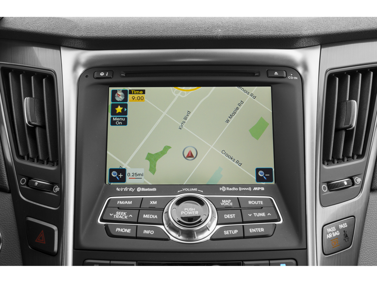 This car is well equipped with the following features: Premium Package (Glossy DLO Surround & Outside Mirror Housing, Panoramic Sunroof, and Radio: AM/FM/SiriusXM/CD/MP3 w/Navigation), 17 x 6.5J Eco-Spoke Aluminum Alloy Wheels, 4-Wheel Disc Brakes, 6 Speakers, ABS brakes, Air Conditioning, Alloy wheels, AM/FM radio: SiriusXM, Anti-whiplash front head restraints, Auto-dimming Rear-View mirror, Automatic temperature control, Brake assist, Bumpers: body-color, Cargo Mat, Cargo Net, Carpeted Floor Mats, CD player, Compass, Delay-off headlights, Driver door bin, Driver vanity mirror, Dual front impact airbags, Dual front side impact airbags, Electronic Stability Control, Emergency communication system: Blue Link, Exterior Parking Camera Rear, First Aid Kit, Four wheel independent suspension, Front anti-roll bar, Front Bucket Seats, Front Center Armrest w/Storage, Front dual zone A/C, Front fog lights, Front reading lights, Fully automatic headlights, Garage door transmitter: HomeLink, Heated door mirrors, Heated Front Bucket Seats, Heated front seats, Illuminated entry, iPod Cable, Leather Seating Surfaces, Leather steering wheel, Low tire pressure warning, Occupant sensing airbag, Option Group 02, Outside temperature display, Overhead airbag, Overhead console, Panic alarm, Passenger door bin, Passenger vanity mirror, Power door mirrors, Power driver seat, Power steering, Power windows, Radio: AM/FM/SiriusXM/CD/MP3 Audio System, Rear anti-roll bar, Rear Bumper Applique, Rear seat center armrest, Rear window defroster, Remote keyless entry, Security system, Speed control, Speed-sensing steering, Speed-Sensitive Wipers, Steering wheel mounted audio controls, Telescoping steering wheel, Tilt steering wheel, Traction control, Trip computer, Turn signal indicator mirrors, and Variably intermittent wipers.
