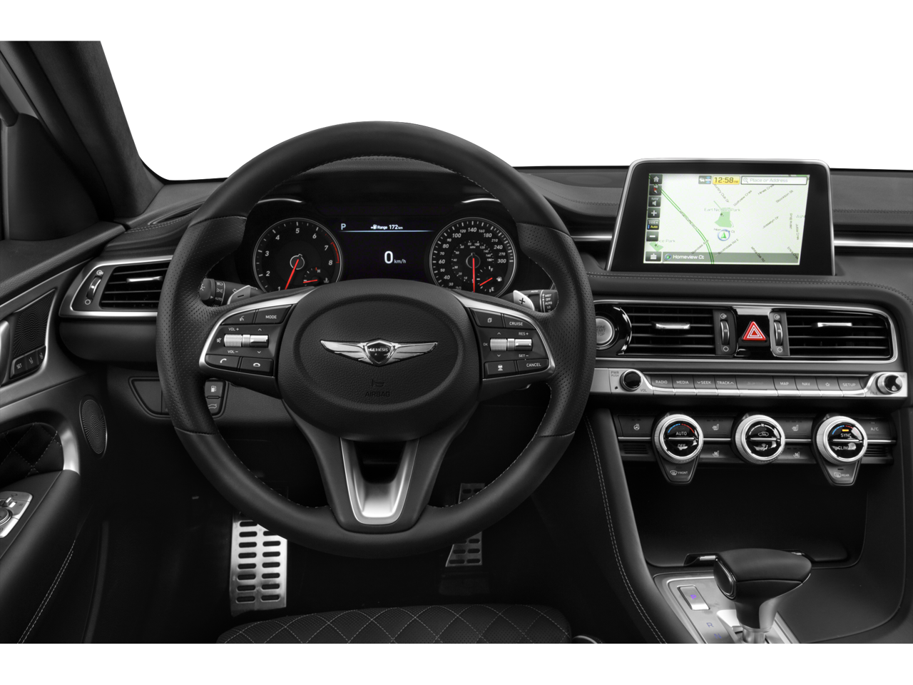 This car is well equipped with the following features: Elite Package (Low Beam Assist, Option Group 06, Parking Distance Warning, Power Tilt-and-Slide Wide Sunroof, Rain-Sensing Wipers, and Wireless Charging Pad), Prestige Package, 15 Speakers, 4-Wheel Disc Brakes, ABS brakes, Air Conditioning, Alloy wheels, AM/FM radio: SiriusXM, Android Auto & Apple CarPlay, Anti-whiplash front head restraints, Auto High-beam Headlights, Auto-dimming door mirrors, Auto-dimming Rear-View mirror, Automatic temperature control, Brake assist, Bumpers: body-color, Delay-off headlights, Driver door bin, Driver vanity mirror, Dual front impact airbags, Dual front side impact airbags, Electronic Stability Control, Emergency communication system: Genesis Connected Services, Exterior Parking Camera Rear, Four wheel independent suspension, Front anti-roll bar, Front Bucket Seats, Front Center Armrest, Front dual zone A/C, Front reading lights, Fully automatic headlights, Garage door transmitter: HomeLink, Heads-Up Display, Heated & Ventilated Front Bucket Seats, Heated door mirrors, Heated front seats, Heated Rear Seats, Illuminated entry, Knee airbag, Leather Seat Trim, Low tire pressure warning, Memory seat, Microfiber Suede Headliner, Nappa Leather Seat Trim w/Luxury Quilting, Navigation System, Occupant sensing airbag, Outside temperature display, Overhead airbag, Overhead console, Panic alarm, Passenger door bin, Passenger vanity mirror, Power door mirrors, Power driver seat, Power passenger seat, Power steering, Power windows, Radio: AM/FM/HD Radio/SiriusXM Lexicon Audio, Rear anti-roll bar, Rear reading lights, Rear seat center armrest, Rear window defroster, Remote keyless entry, Security system, Speed control, Speed-Sensitive Wipers, Split folding rear seat, Steering wheel memory, Steering wheel mounted audio controls, Surround View Monitor, Tachometer, Telescoping steering wheel, Tilt steering wheel, Traction control, Trip computer, Turn signal indicator mirrors, Variably intermittent wipers, and Ventilated front seats.