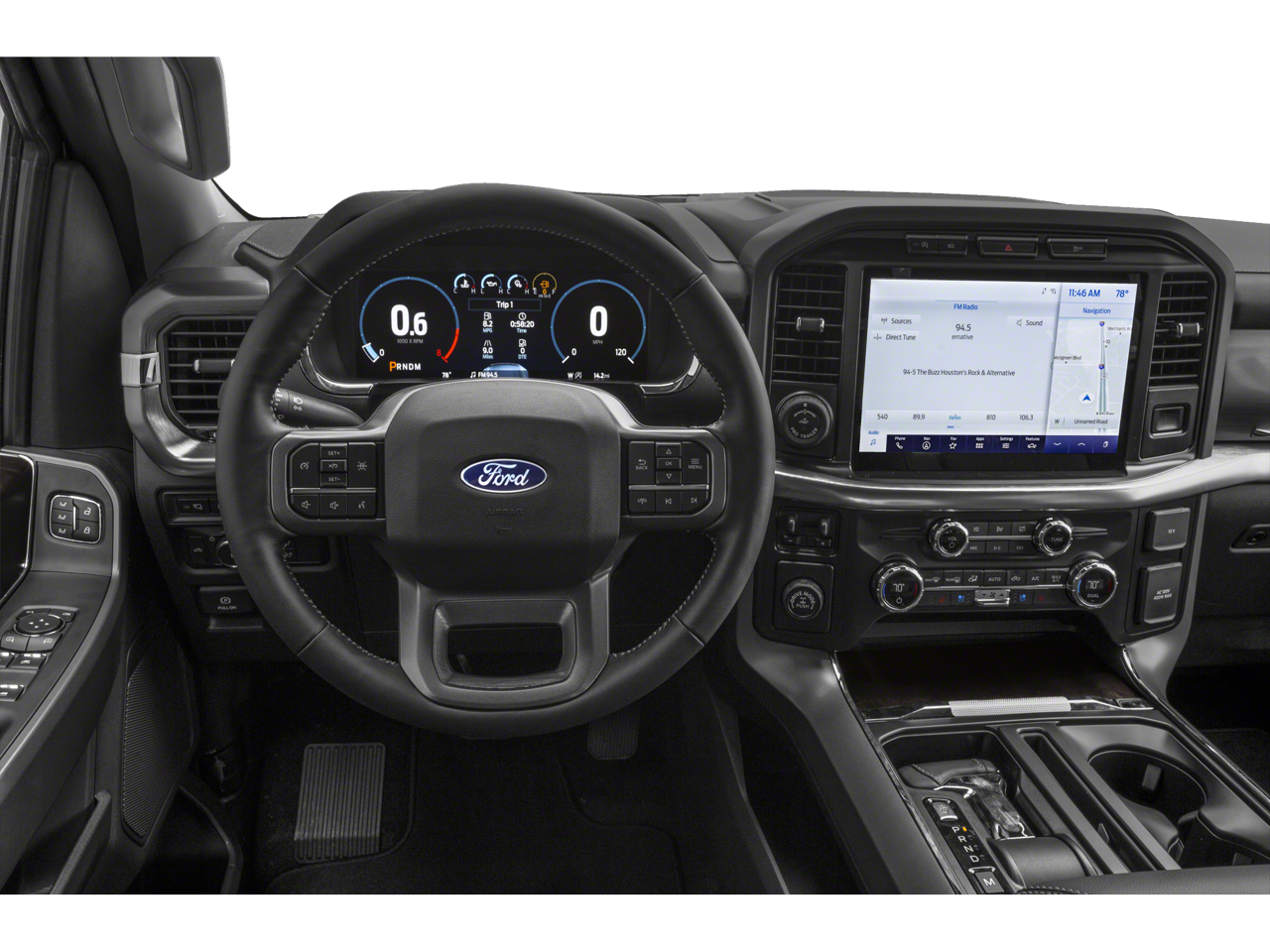 This car is well equipped with the following features: Equipment Group 500A Standard, FX4 Off-Road Package, 18 Machined-Aluminum Wheels, 4-Wheel Disc Brakes, 7 Speakers, ABS brakes, Adjustable pedals, Air Conditioning, Alloy wheels, AM/FM radio: SiriusXM with 360L, Auto High-beam Headlights, Auto-dimming door mirrors, Auto-dimming Rear-View mirror, Automatic temperature control, Brake assist, Bumpers: chrome, Class IV Trailer Hitch Receiver, Compass, Delay-off headlights, Driver door bin, Driver vanity mirror, Dual front impact airbags, Dual front side impact airbags, Electronic Stability Control, Emergency communication system: SYNC 4 911 Assist, Exterior Parking Camera Rear, Front anti-roll bar, Front Center Armrest w/Storage, Front dual zone A/C, Front fog lights, Front reading lights, Front wheel independent suspension, Fully automatic headlights, Heated door mirrors, Heated front seats, Illuminated entry, Integrated Trailer Brake Controller, Leather-Trimmed 40/20/40 Front Seat, Low tire pressure warning, Memory seat, Navigation system: Connected Navigation (90-Day Trial), Occupant sensing airbag, Onboard 400W Outlet, Outside temperature display, Overhead airbag, Overhead console, Panic alarm, Passenger door bin, Passenger vanity mirror, Pedal memory, Power door mirrors, Power driver seat, Power passenger seat, Power steering, Power windows, Radio data system, Radio: AM/FM SiriusXM w/360L, Rear reading lights, Rear seat center armrest, Rear step bumper, Rear window defroster, Remote keyless entry, Security system, Speed control, Speed-sensing steering, Split folding rear seat, Steering wheel mounted audio controls, SYNC 4 w/Enhanced Voice Recognition, Tachometer, Telescoping steering wheel, Tilt steering wheel, Tough Bed Spray-In Bedliner, Traction control, Tray Style Floor Liner (47W), Trip computer, Turn signal indicator mirrors, Variably intermittent wipers, Ventilated front seats, and Voltmeter.