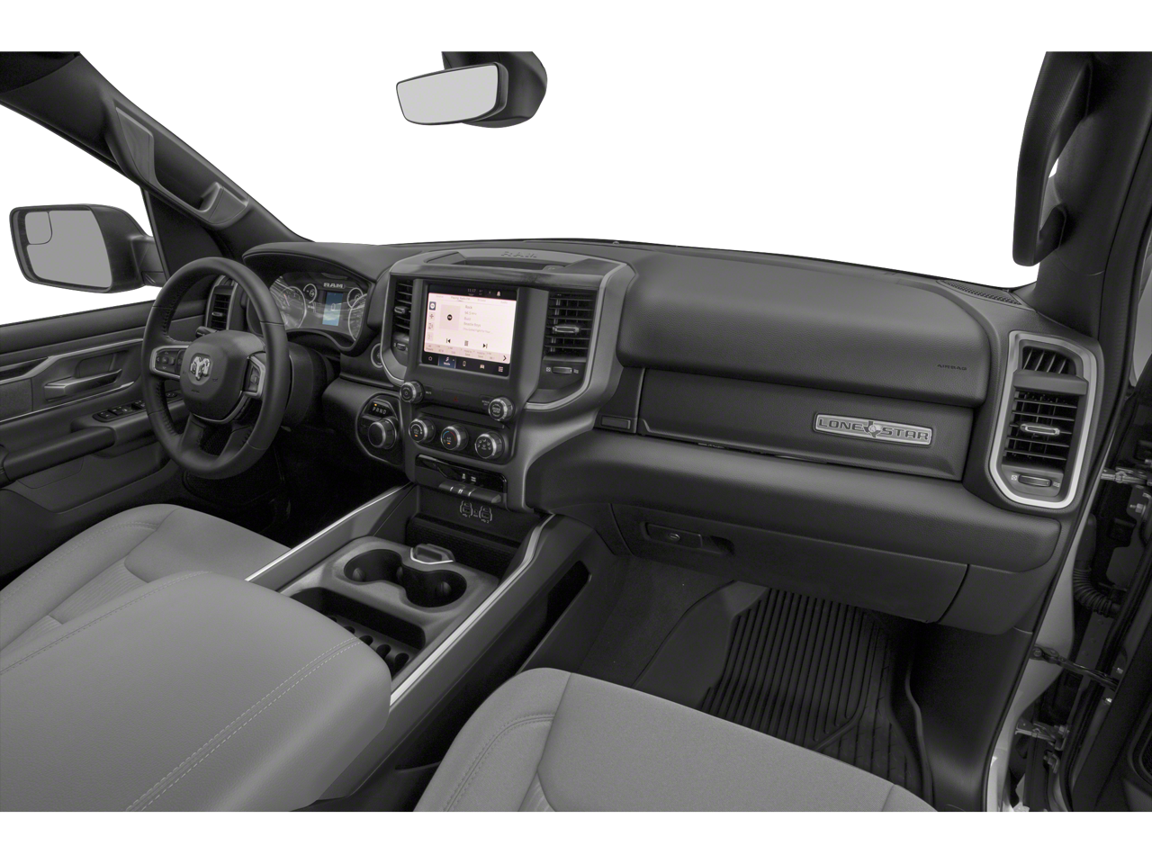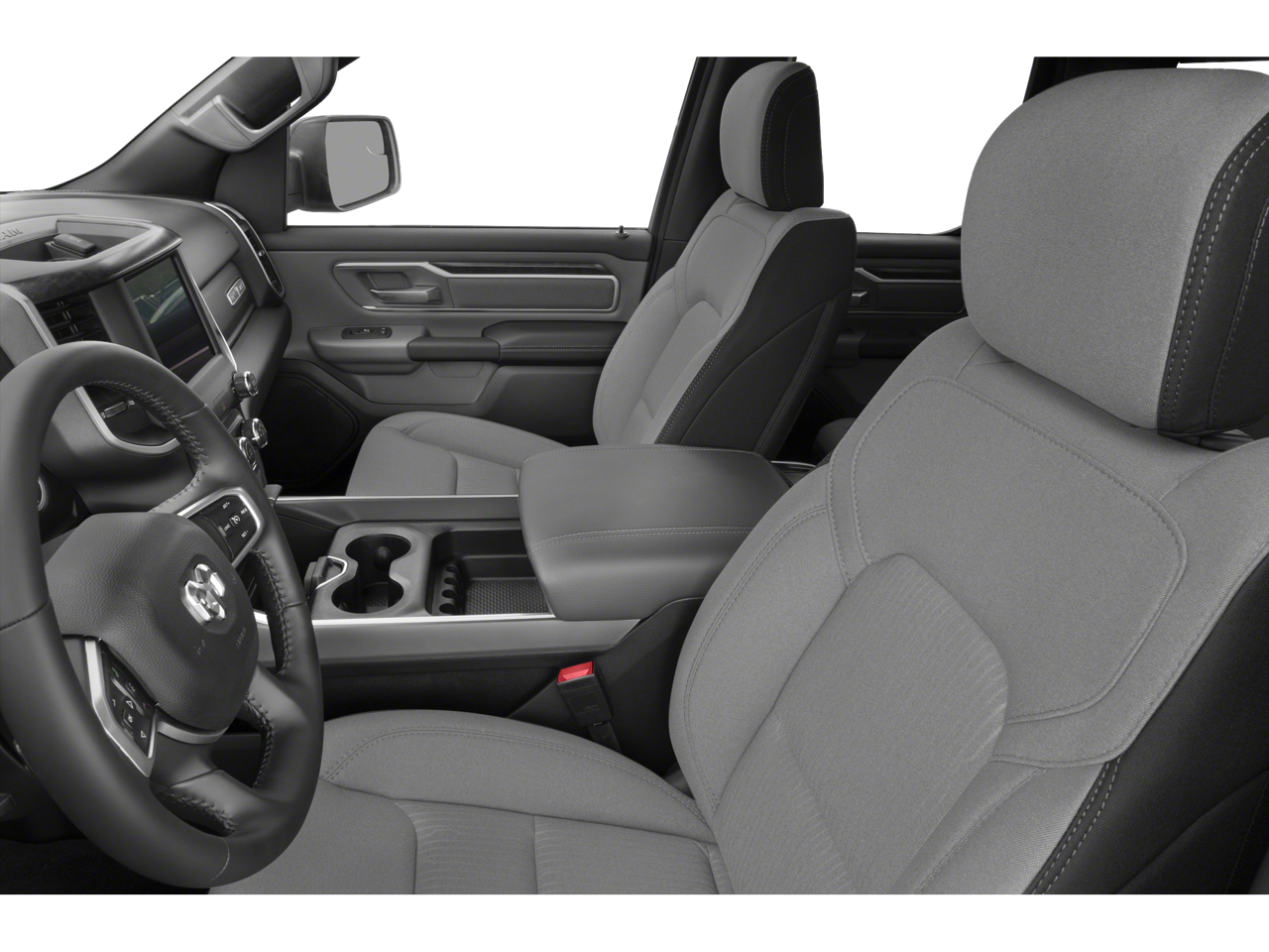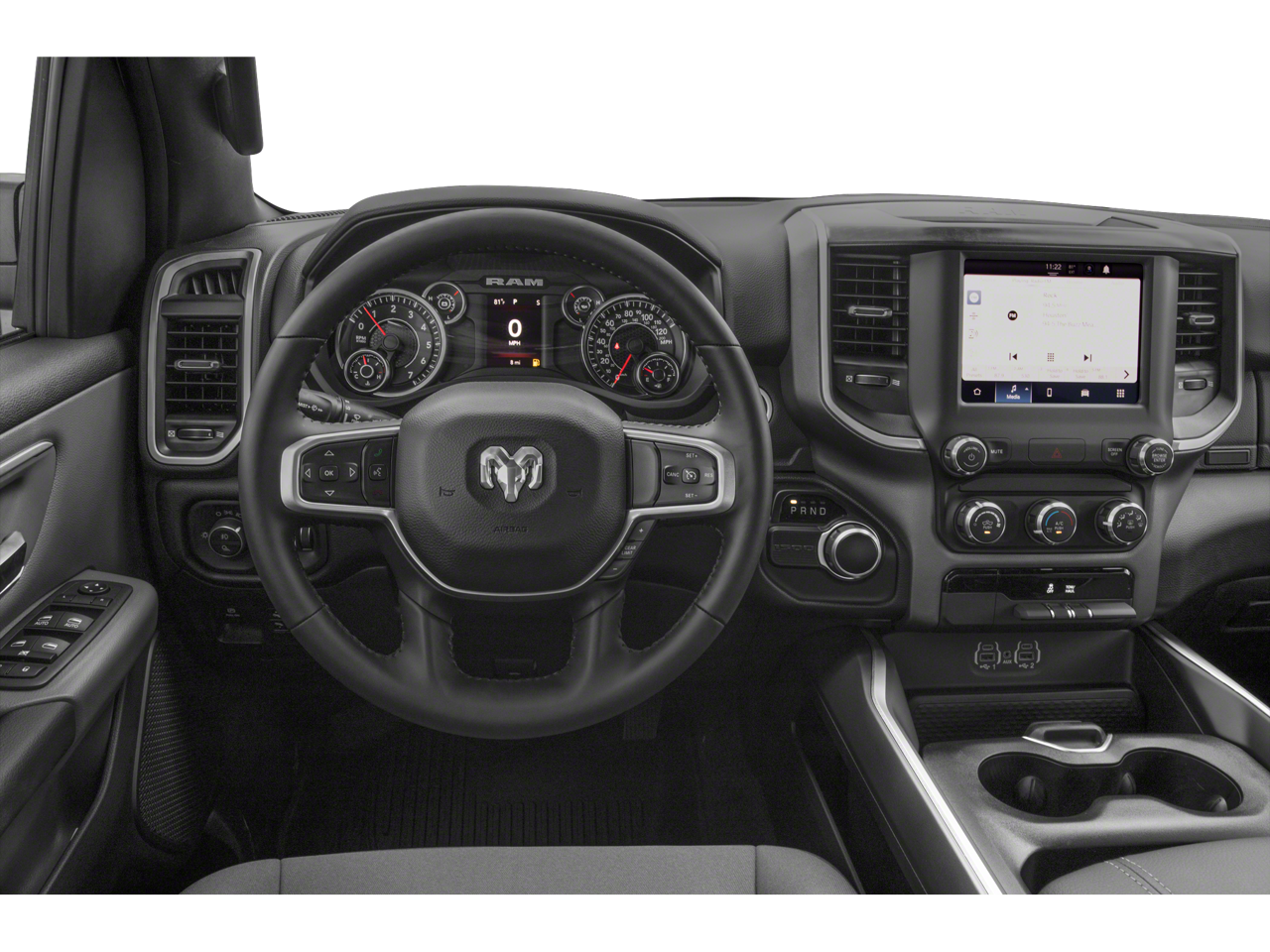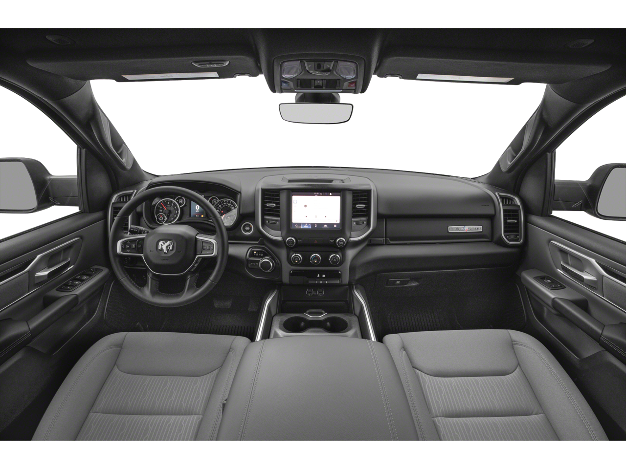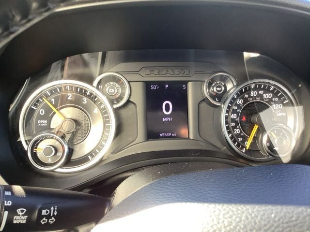 This car is well equipped with the following features: Quick Order Package 23Z Big Horn (Big Horn Badge), 3 Rear Seat Head Restraints, 3.21 Rear Axle Ratio, 4 Way Front Headrests, 4-Wheel Disc Brakes, 48V Belt Starter Generator, 6 Speakers, ABS brakes, Air Conditioning, Alloy wheels, AM/FM radio, Black Exterior Mirrors, Brake assist, Bumpers: chrome, Cloth Bench Seat, Compass, Convex Wide-Angle Mirror Insert, Delay-off headlights, Driver door bin, Dual front impact airbags, Dual front side impact airbags, Electronic Stability Control, Emergency communication system: SiriusXM Guardian, Front anti-roll bar, Front Center Armrest w/Storage, Front fog lights, Front License Plate Bracket, Front reading lights, Front Seat Back Map Pockets, Front wheel independent suspension, Fully automatic headlights, Global Telematics Box Module (TBM), GPS Antenna Input, Heated door mirrors, Illuminated entry, Integrated Voice Command w/Bluetooth®, Leather steering wheel, Low tire pressure warning, Manual Adjust 4-Way Front Passenger Seat, Manufacturer's Statement of Origin, Occupant sensing airbag, Outside temperature display, Overhead airbag, Overhead console, Panic alarm, ParkView Rear Back-Up Camera, Passenger door bin, Passenger vanity mirror, Power door mirrors, Power steering, Power windows, Radio data system, Radio: Uconnect 3 w/5 Display, Rear 60/40 Folding Seat, Rear anti-roll bar, Rear seat center armrest, Rear step bumper, Remote keyless entry, Speed control, Split folding rear seat, Steering wheel mounted audio controls, Tachometer, Telescoping steering wheel, Tilt steering wheel, Traction control, Trip computer, Variably intermittent wipers, Voltmeter, and Wheels: 18 x 8 Cast-Aluminum Painted.