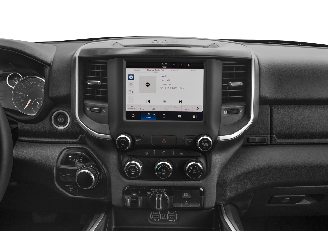 This car is well equipped with the following features: Big Horn Level 1 Equipment Group (2nd Row In Floor Storage Bins, 4G LTE Wi-Fi Hot Spot, 8.4 Touchscreen Display, Apple CarPlay, Auto-Dimming Exterior Driver Mirror, Auto-Dimming Rear-View Mirror, Black Exterior Mirrors, Black Premium Power Mirrors, Bluetooth® Handsfree Phone & Audio, Class IV Receiver Hitch, Connectivity - US/Canada, Convex Wide-Angle Exterior Mirror Insert, Electric Shift-On-Demand Transfer Case, Exterior Mirrors Courtesy Lamps, Exterior Mirrors w/Heating Element, Exterior Mirrors w/Supplemental Signals, For Details, Visit DriveUconnect.com, For More Info, Call 800-643-2112, Front Fog Lamps, Glove Box Lamp, Google Android Auto, GPS Antenna Input, Heated Front Seats, Heated Steering Wheel, Integrated Center Stack Radio, Passenger Sun Visor w/Illuminated Mirror, Power-Folding Mirrors, Radio: Uconnect 5 W w/8.4 Display, Rear Dome w/On/Off Switch Lamp, Rear Power Sliding Window, Rear Window Defroster, SiriusXM Satellite Radio, and USB Host Flip), Off Road Group (E-Locker Rear Axle, Front Extra HD Shock Absorbers, Off Road Decals, Raised Ride Height, Rear Extra HD Shock Absorbers, Selec-Speed (TM) Control, and Tow Hooks), Quick Order Package 27Z Big Horn (Big Horn Badge), 3 Rear Seat Head Restraints, 3.21 Rear Axle Ratio, 4 Way Front Headrests, 4-Wheel Disc Brakes, 48V Belt Starter Generator, 6 Speakers, ABS brakes, Air Conditioning, Alloy wheels, AM/FM radio, Brake assist, Bumpers: chrome, Cloth Bench Seat, Compass, Delay-off headlights, Driver door bin, Dual front impact airbags, Dual front side impact airbags, Electronic Stability Control, Emergency communication system: SiriusXM Guardian, Front anti-roll bar, Front Center Armrest w/Storage, Front License Plate Bracket, Front reading lights, Front Seat Back Map Pockets, Front wheel independent suspension, Fully automatic headlights, Global Telematics Box Module (TBM), Heated door mirrors, Illuminated entry, Integrated Voice Command w/Bluetooth®, Leather steering wheel, Low tire pressure warning, Occupant sensing airbag, Outside temperature display, Overhead airbag, Overhead console, Panic alarm, ParkView Rear Back-Up Camera, Passenger door bin, Passenger vanity mirror, Power door mirrors, Power steering, Power windows, Radio data system, Radio: Uconnect 3 w/5 Display, RAM Grille Badge - Chrome, Rear 60/40 Folding Seat, Rear anti-roll bar, Rear seat center armrest, Rear step bumper, Remote keyless entry, Remote Start System, Speed control, Split folding rear seat, Steering wheel mounted audio controls, Tachometer, Telescoping steering wheel, Tilt steering wheel, Traction control, Trailer Brake Control, Trip computer, Variably intermittent wipers, Voltmeter, and Wheels: 18 x 8 Cast-Aluminum PainteD.