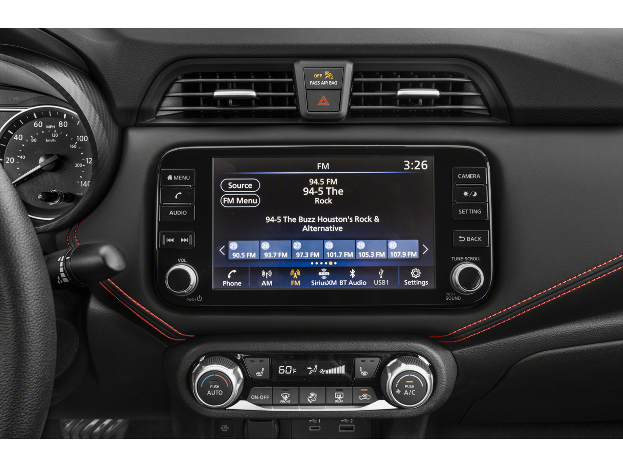 - Radio: AM/FM Audio System -inc: RDS, MP3, aux-in, 8" color touchscreen display, SiriusXM radio, NissanConnect services, Wi-Fi Hotspot, Bluetooth hands-free phone system, streaming audio via Bluetooth, interface for iPod and other compatible devices, hands-free text messaging assistant, Siri Eyes Free/Google Assistant voice recognition, 6 speakers, 3 USB ports (2-charge only) and 1 USB-C port on center cluster